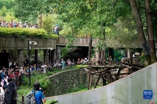 8月21日,游客在美國首都華盛頓史密森學會國家動物園觀看大熊貓幼崽“小奇跡”過生日。新華社記者 劉杰 攝