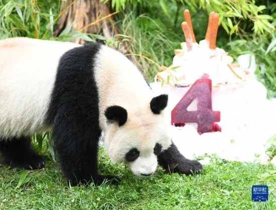 在當(dāng)天的活動上,柏林動物園看護(hù)團(tuán)隊為“夢想”和“夢圓”準(zhǔn)備了由蘋果和胡蘿卜等制成的多層冰激凌蛋糕,蛋糕上還有用甜菜根汁冰塊雕刻的數(shù)字“4”。