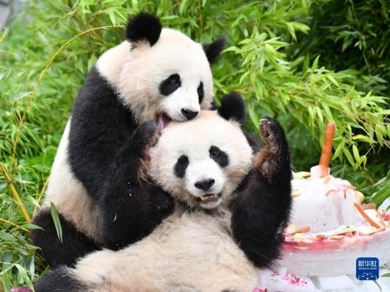 8月31日,大熊貓“夢想”(左)和“夢圓”在德國柏林動物園享用“生日餐”。當(dāng)日,在德國出生的大熊貓雙胞胎兄弟“夢想”和“夢圓”迎來4歲生日,柏林動物園為它們舉辦了慶祝活動。新華社記者 任鵬飛 攝