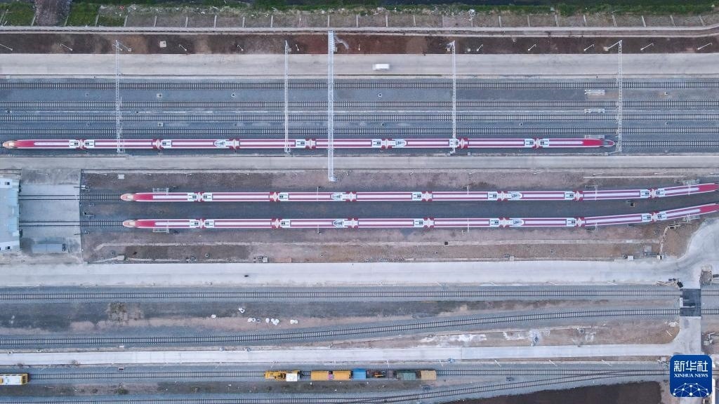 7月20日,雅萬(wàn)高鐵列車停靠在印度尼西亞萬(wàn)隆德卡魯爾動(dòng)車所附近(無(wú)人機(jī)照片)。新華社記者 徐欽 攝