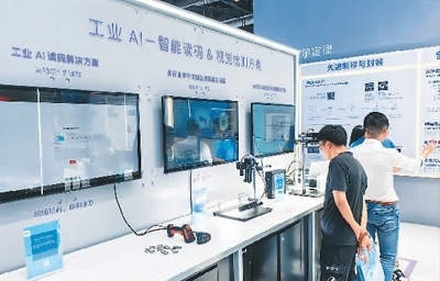觀眾在英特爾展區(qū)的工業(yè)AI展臺參觀手持智能終端、視覺控制器等設備。