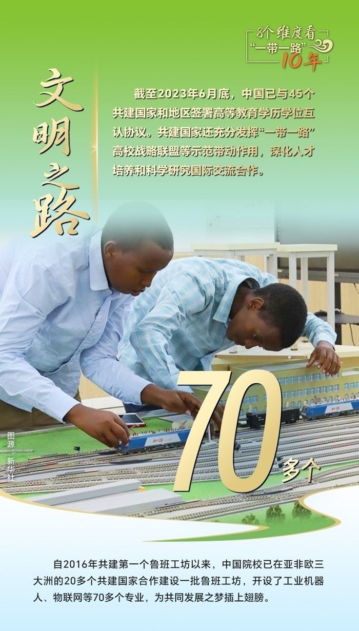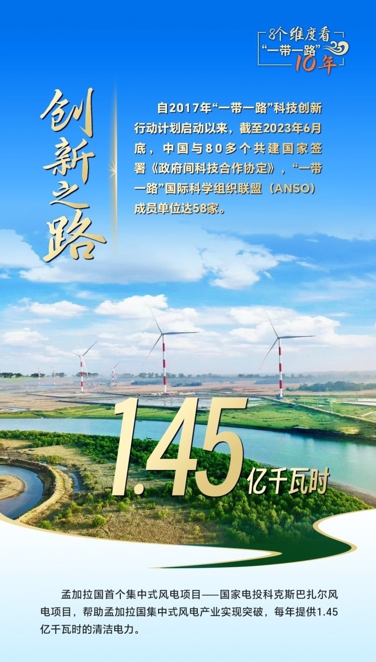 10年來,創(chuàng)新始終是一個(gè)關(guān)鍵詞,中國(guó)與共建國(guó)家加強(qiáng)科技創(chuàng)新合作,加速集聚創(chuàng)新資源,為共建“一帶一路”注入強(qiáng)勁動(dòng)力。截至2023年6月底,中國(guó)與80多個(gè)共建國(guó)家簽署《政府間科技合作協(xié)定》,“一帶一路”國(guó)際科學(xué)組織聯(lián)盟(ANSO)成員單位達(dá)58家;2013年以來,中國(guó)支持逾萬名共建國(guó)家青年科學(xué)家來華開展短期科研工作和交流,累計(jì)培訓(xùn)共建國(guó)家技術(shù)和管理人員1.6萬余人次;累計(jì)幫助50多個(gè)非洲國(guó)家建成20多個(gè)農(nóng)業(yè)技術(shù)示范中心,在農(nóng)業(yè)、新能源、衛(wèi)生健康等領(lǐng)域啟動(dòng)建設(shè)50余家“一帶一路”聯(lián)合實(shí)驗(yàn)室。