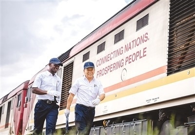 在肯尼亞內(nèi)羅畢,非洲之星鐵路運營公司機輛部的火車駕駛員(右)與學(xué)員從蒙內(nèi)鐵路機車旁走過。新華社記者 王冠森攝