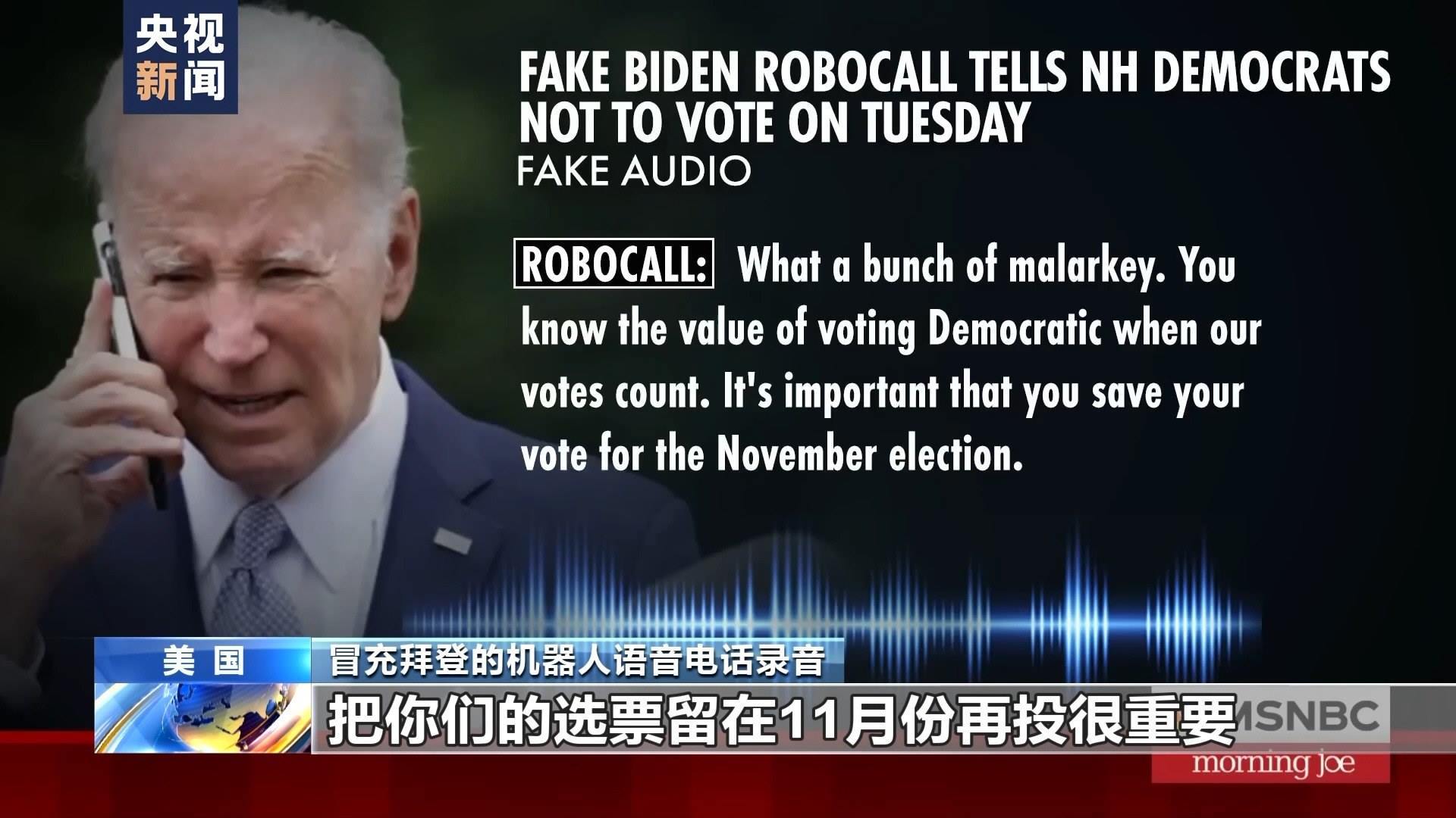 冒充拜登的機(jī)器人語音電話錄音:把你們的選票留在11月份再投很重要。在這周二(23日)投票,只會讓共和黨人得逞,讓特朗普再次當(dāng)選為共和黨候選人。
