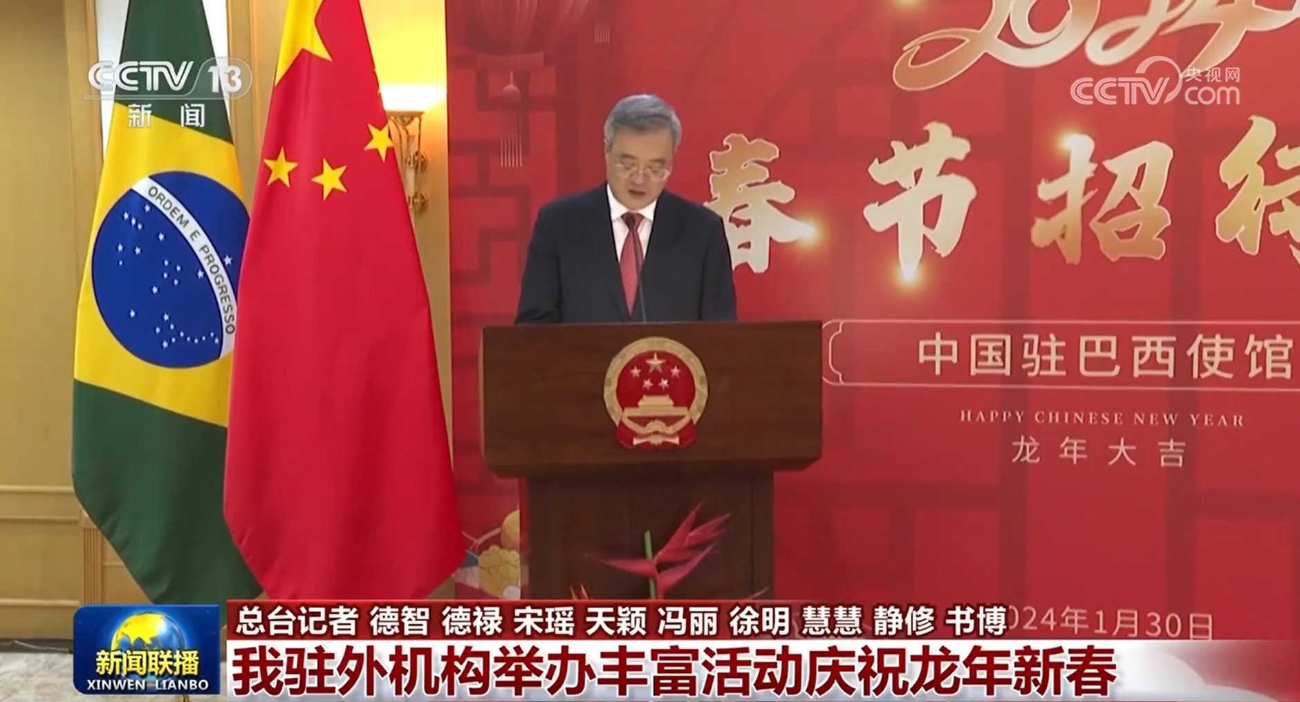 央視網(wǎng)消息(新聞聯(lián)播):連日來(lái),我駐國(guó)際組織代表團(tuán)和駐多國(guó)使館舉辦春節(jié)招待會(huì)等活動(dòng),共慶龍年新春。