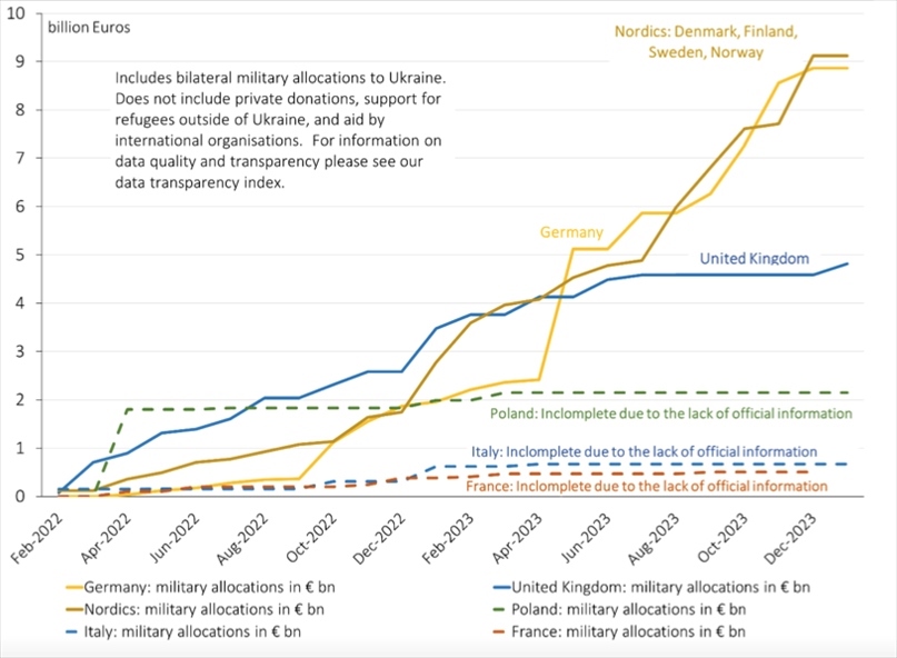 △歐洲國家對烏軍援圖表(圖片來源:基爾世界經(jīng)濟研究所)