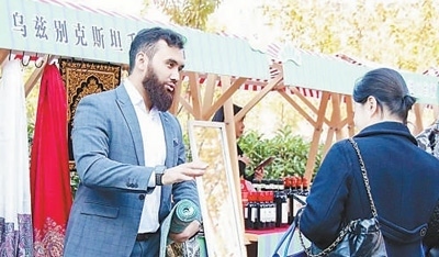 攜手奔向下一個(gè)金色十年(2023·年終專稿) 阿森貝克(左)在一場校園活動(dòng)中介紹烏茲別克斯坦手工......