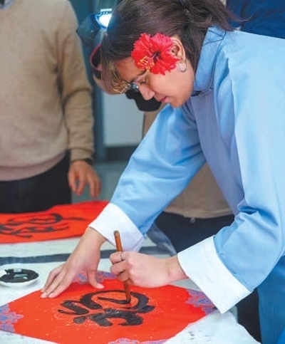 安雅在學(xué)校為留學(xué)生舉辦的新春活動(dòng)上用毛筆書(shū)寫“?!弊帧J茉L者供圖