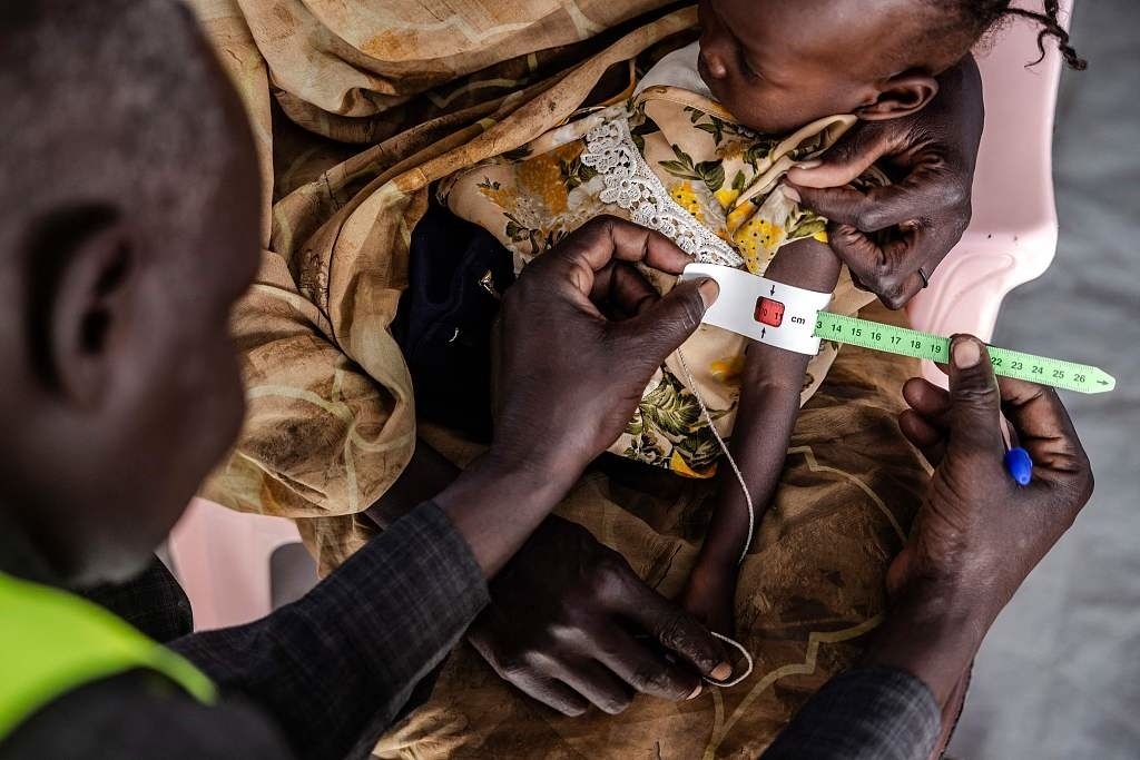 當?shù)貢r間2024年2月13日,南蘇丹,在難民中轉(zhuǎn)中心的診所里,一名醫(yī)護工作人員在測量一名蘇丹兒童的手臂周長。