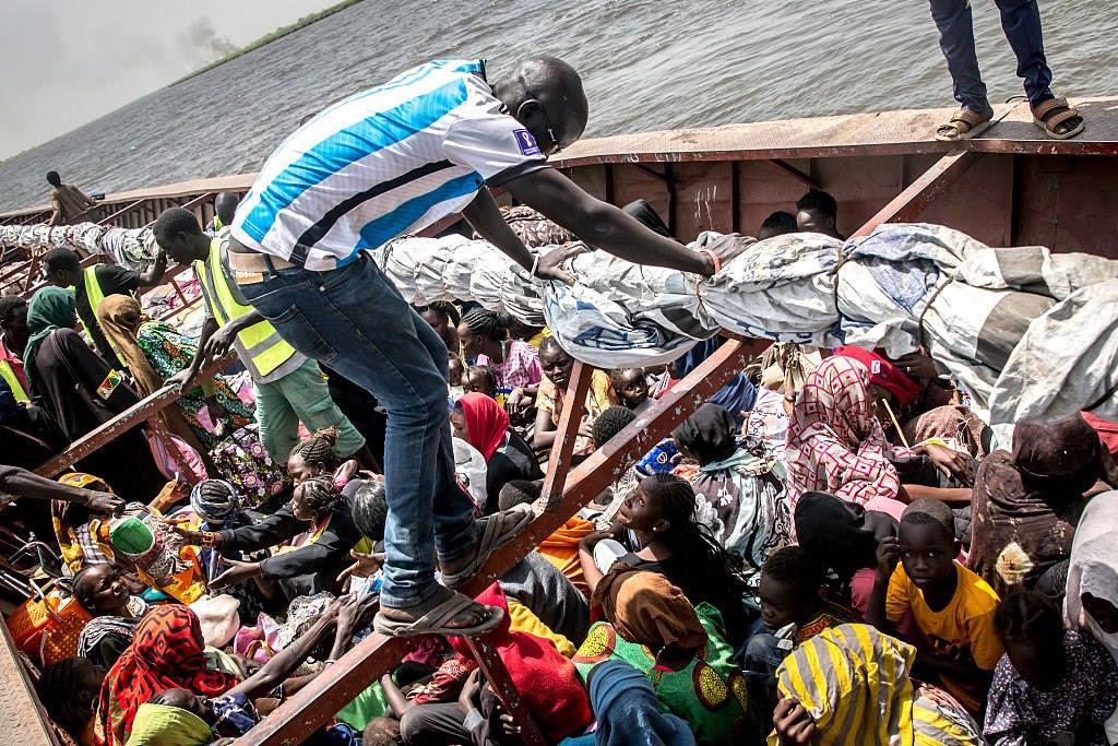 當?shù)貢r間2024年3月21日,人們坐上船只抵達南蘇丹,逃離沖突。