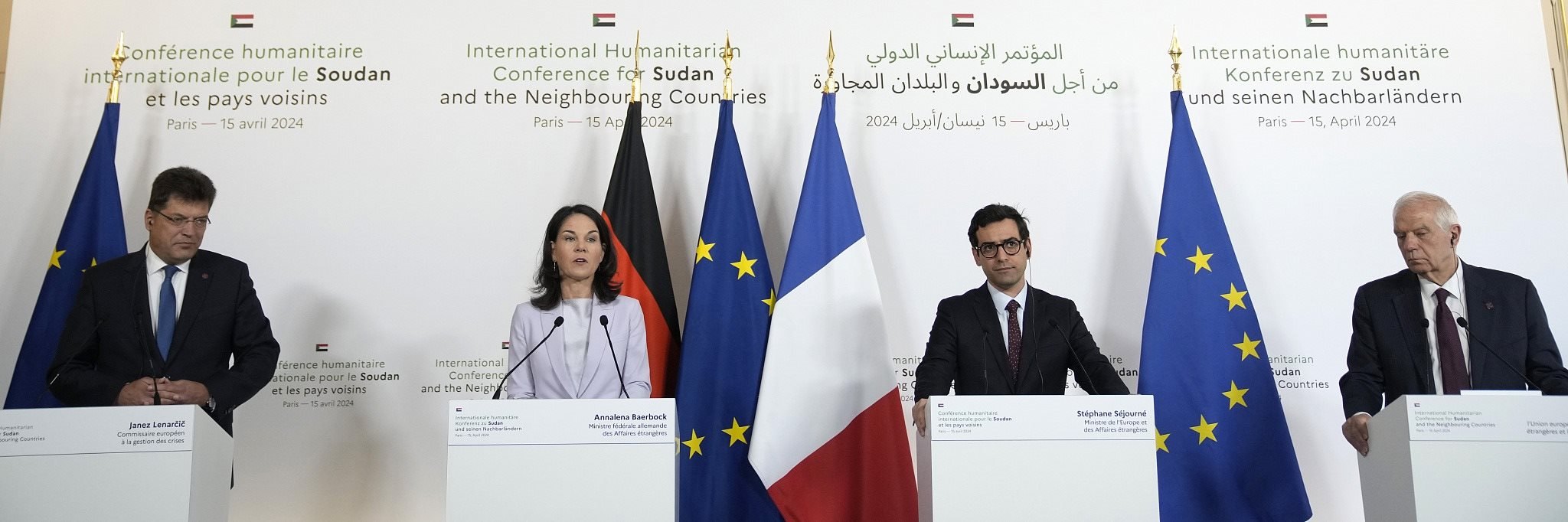 當?shù)貢r間2024年4月15日,法國巴黎,法國外交部長斯特凡納·塞茹爾內(nèi)(右二),德國外交部長安娜萊娜·貝爾伯克,歐盟危機管理專員約翰·萊納西奇(左)和歐盟外交與安全事務高級代表何塞普·博雷利參加了蘇丹及其鄰國國際人道主義會議的聯(lián)合新聞發(fā)布會。