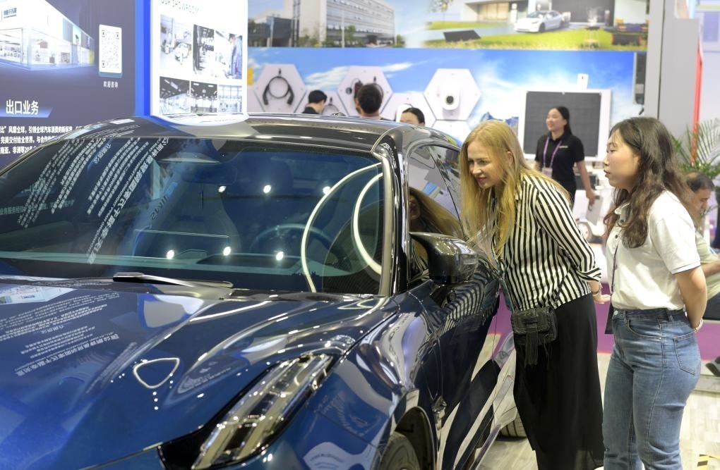 4月15日,采購商在第135屆廣交會(huì)上參觀新能源汽車。新華社記者盧漢欣攝