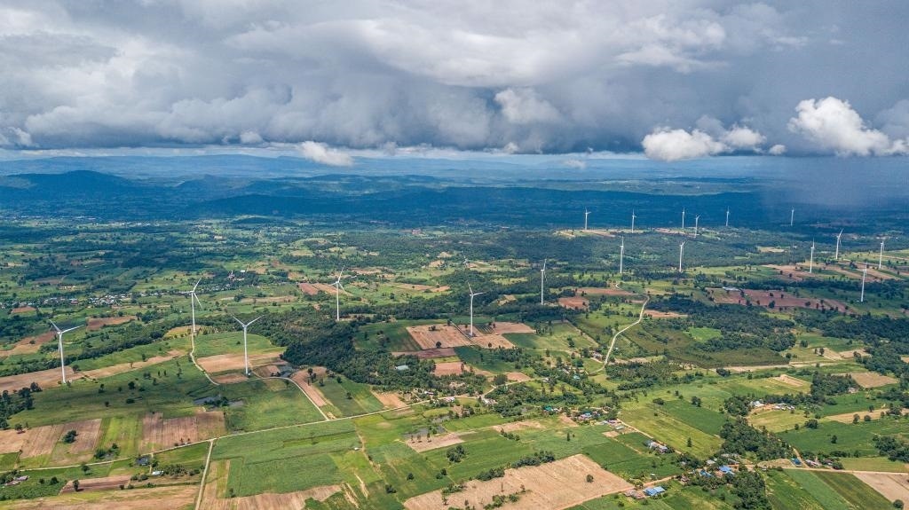 這是2023年10月5日在泰國(guó)猜也蓬府拍攝的由中國(guó)金風(fēng)科技提供的風(fēng)力發(fā)電機(jī)(無人機(jī)照片)。新華社記者王騰攝