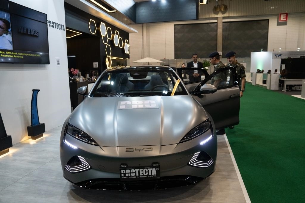 ?4月4日,在巴西圣保羅舉行的巴西防務(wù)展上,參觀者體驗(yàn)一輛經(jīng)過防彈加固的比亞迪海豹電動汽車。新華社記者王天聰攝