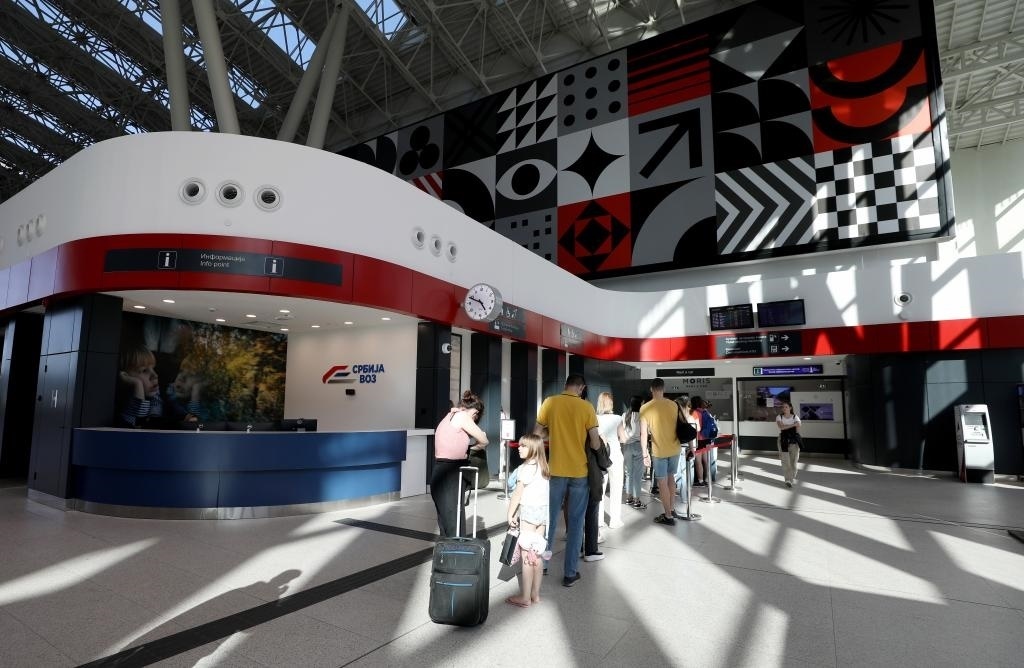 ?4月29日,在塞爾維亞貝爾格萊德中央火車(chē)站,人們?cè)谂抨?duì)購(gòu)買(mǎi)車(chē)票。新華社記者李穎攝
