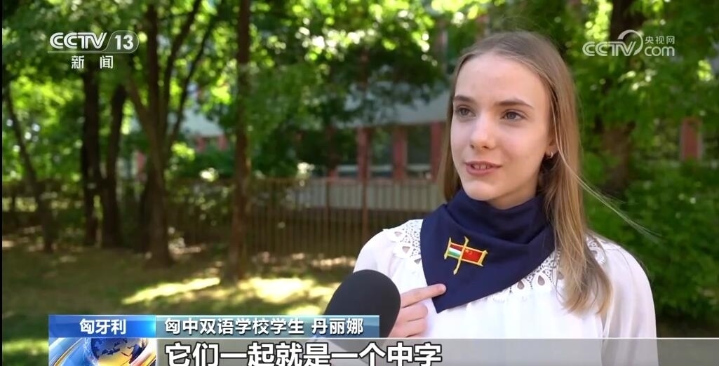 匈中雙語學(xué)校學(xué)生丹麗娜說:“我很開心可以見到他們。我說,您好,我是匈中雙語學(xué)校的丹麗娜,歡迎來到匈牙利。這個領(lǐng)帶上可以看到匈牙利國旗和中國國旗,它們一起就是一個中字,這領(lǐng)帶代表兩個國家的友誼。我學(xué)了10年漢語,將來這個語言會給我打開很多工作的新門?!?/p>