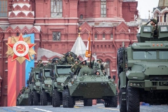 5月9日,在俄羅斯首都莫斯科,軍車(chē)編隊(duì)駛過(guò)紅場(chǎng)。新華社記者曹陽(yáng)攝