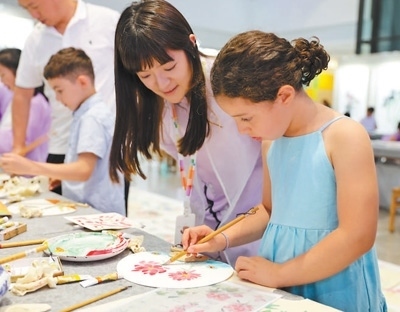 活動(dòng)現(xiàn)場(chǎng),一名外國(guó)小朋友在老師的指導(dǎo)下,正在中國(guó)傳統(tǒng)扇面上繪制花朵圖案。本報(bào)記者 崔 琦攝