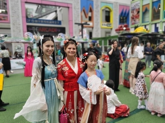 6月9日,端午小長假第二天,在上海金橋的一處商業(yè)中心里,身著中國古代服飾的外國人與中國兒童合影。新華社記者 陳愛平 攝