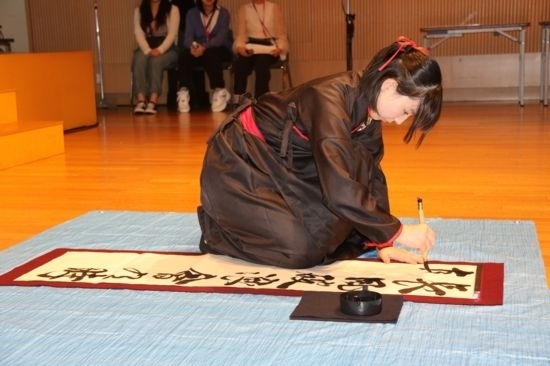 6月15日,在日本東京,選手在“漢語橋”世界中學生中文比賽日本賽區(qū)決賽中展示中文書法。記者 胡曉格 攝