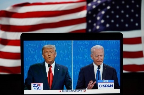 這張2020年10月22日在美國(guó)弗吉尼亞州阿靈頓拍攝的視頻畫(huà)面顯示,時(shí)任美國(guó)總統(tǒng)特朗普(左)與民主黨總統(tǒng)候選人拜登在田納西州納什維爾市參加最后一場(chǎng)總統(tǒng)候選人電視辯論。新華社記者劉杰攝