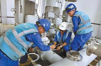 工作人員正在對阿聯(lián)酋烏姆蓋萬海水淡化設(shè)備管道系統(tǒng)進行維護。盧偉寧攝