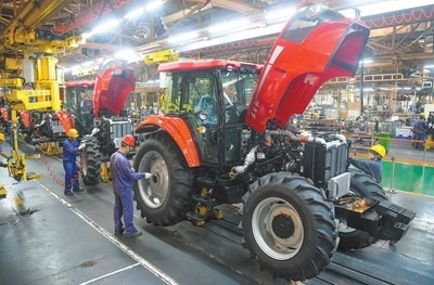 2024年5月,在位于河南洛陽市的中國一拖大拖公司總裝生產(chǎn)線上,工人正在裝配拖拉機。張怡熙攝(影像中國)