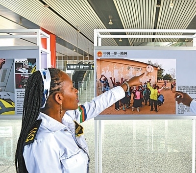 3月22日,在肯尼亞首都內(nèi)羅畢,當?shù)厝嗽诿蓛?nèi)鐵路內(nèi)羅畢火車站參觀中非共建“一帶一路”務實合作圖片展。新華社記者 韓 旭攝