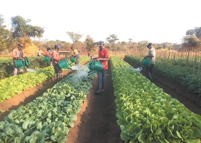 剛果(金)農(nóng)業(yè)種植培訓示范基地的當?shù)貙W員在為蔬菜澆水。北方礦業(yè)拉米卡公司供圖