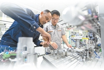 天津職業(yè)技術(shù)師范大學(xué)埃塞俄比亞博士留學(xué)生涂則鋼(左)在老師的指導(dǎo)下調(diào)試儀器。新華社記者 孫凡越攝