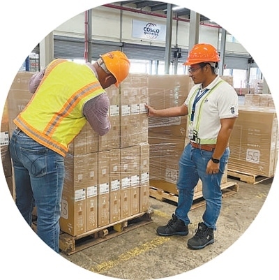 “海運(yùn)+海外倉”是中遠(yuǎn)海運(yùn)探索出的“一站式”全程綜合物流服務(wù)模式,集海運(yùn)、倉儲(chǔ)、報(bào)關(guān)等服務(wù)于一體。圖為在巴拿馬科隆自由貿(mào)易區(qū)內(nèi)的中遠(yuǎn)海運(yùn)海外倉,工作人員對(duì)抵達(dá)的貨物進(jìn)行質(zhì)檢??逅埂ぐ嗟夏釘z