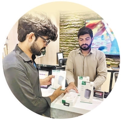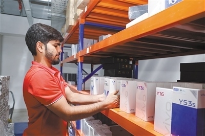 中國企業(yè)位于巴基斯坦的海外倉將中國制造的數(shù)碼產(chǎn)品等高附加值貨物快速配送至本地線下零售商網(wǎng)絡(luò),顯著提升效率和靈活性。圖為海外倉的送貨員正在與當(dāng)?shù)厣虘艚唤迂浳铩1緢?bào)巴基斯坦分社 賽義德·邁赫迪攝