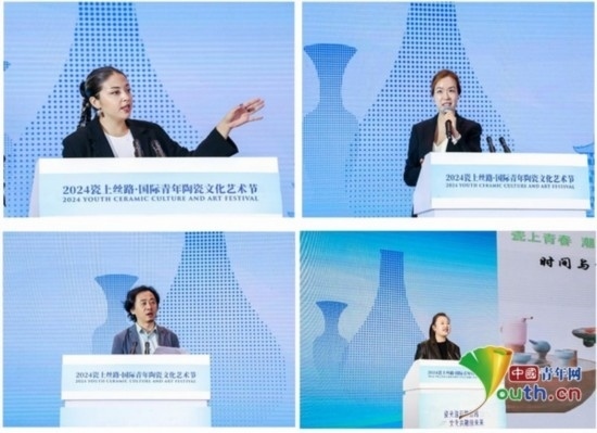 在主題演講環(huán)節(jié),四名陶瓷藝術(shù)領(lǐng)域青年藝術(shù)家代表分別上臺(tái)做了分享。土耳其青年藝術(shù)家佩琳因?qū)μ沾晌幕纳詈衽d趣而來到景德鎮(zhèn),她分享了自己對(duì)陶瓷文化的思考與理解,她認(rèn)為“陶瓷藝術(shù)飽含著人們對(duì)文化多樣性繁榮發(fā)展、美美與共的美好期許”。韓國(guó)青年藝術(shù)家宋耎姝以自己的作品《銀之?!窞槔痛蠹曳窒砹藙?chuàng)作感悟,她認(rèn)為“陶瓷藝術(shù)創(chuàng)作應(yīng)當(dāng)關(guān)注人與自然的和諧關(guān)系,從大自然中汲取養(yǎng)分”。第十二屆全國(guó)青聯(lián)委員、江西省青聯(lián)副主席、國(guó)家級(jí)技能大師工作室領(lǐng)辦人歐陽(yáng)敏致力于陶瓷文化的傳播,他在分享中強(qiáng)調(diào),“陶瓷文化是中華文明與世界文明交流互鑒的橋梁和載體。各國(guó)青年應(yīng)當(dāng)做文化傳承創(chuàng)新的踐行者,充分挖掘各國(guó)歷史文化的獨(dú)特魅力和時(shí)代價(jià)值,把傳統(tǒng)文化與潮流文化融匯在陶瓷藝術(shù)的創(chuàng)作中,為共同推動(dòng)人類文明發(fā)展進(jìn)步貢獻(xiàn)青春力量?!本暗骆?zhèn)學(xué)院陶瓷美術(shù)與設(shè)計(jì)藝術(shù)學(xué)院院長(zhǎng)張博以《陶瓷藝術(shù)在空間中的應(yīng)用》為題,分享了陶瓷文化所代表的中華傳統(tǒng)文化如何與當(dāng)代潮流文化相結(jié)合,共同繪制出一幅幅五彩斑斕的人類文明畫卷。
