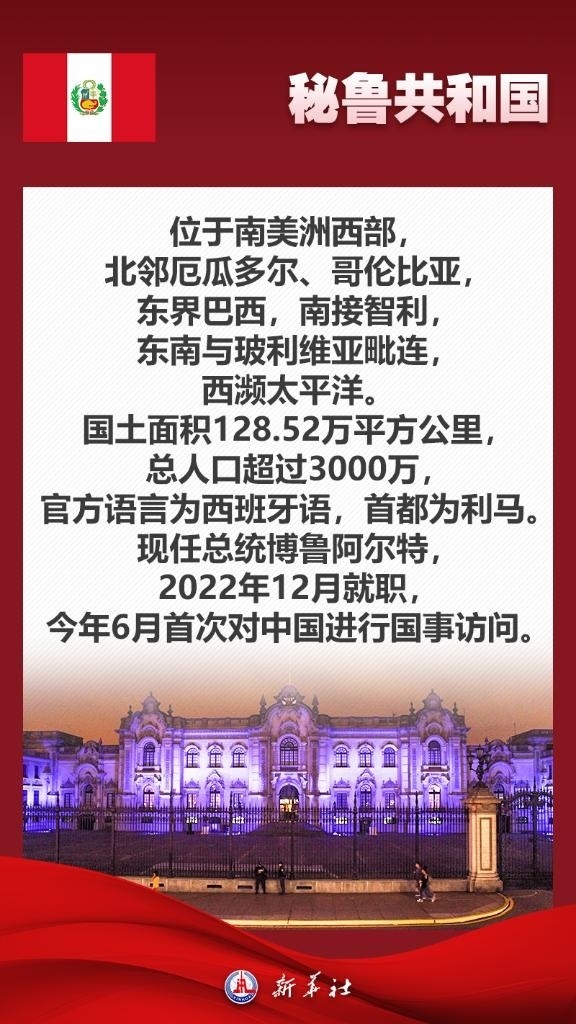 應(yīng)秘魯共和國總統(tǒng)博魯阿爾特邀請(qǐng),國家主席習(xí)近平將于11月13日至17日赴利馬出席亞太經(jīng)合組織第三十一次領(lǐng)導(dǎo)人非正式會(huì)議并對(duì)秘魯進(jìn)行國事訪問。秘魯位于南美洲西部,是印加文明發(fā)祥地,也是最早同新中國建交的拉美國家之一。關(guān)于秘魯,七張海報(bào)帶你了解更多——