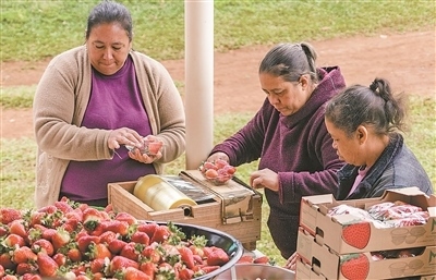 中國三峽巴西公司在位于巴西南部格利保吉水電站周邊開展創(chuàng)收創(chuàng)業(yè)試點項目。圖為當?shù)剞r(nóng)戶正在分裝草莓。納塔利婭·弗洛爾攝