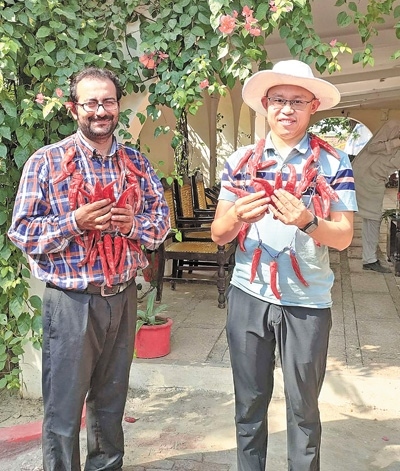 參與中國—巴基斯坦辣椒種植合作項目的中國專家與當?shù)丶夹g員共同慶祝辣椒豐收。本報巴基斯坦分社 瓦卡斯·阿赫邁德攝