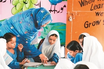 走進(jìn)干凈整潔的校園,讀書聲、嬉戲聲聲聲入耳,孩童的活力、青春氣息撲面而來。在八年級(jí)的課室里,戴著一條寫有“文學(xué)比賽冠軍”紅綬帶的女學(xué)生薩伊巴·阿斯加爾·阿里成功搶到了回答問題的機(jī)會(huì),正在大聲地在全班面前朗誦英語課文。薩伊巴告訴記者,她有7個(gè)姐妹,如果沒有這所學(xué)校,她可能就沒學(xué)上了。