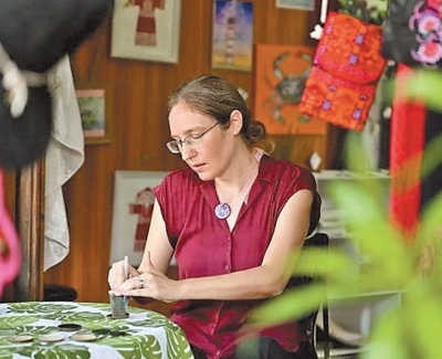 謝敏來(lái)自美國(guó)芝加哥,曾是一名英語(yǔ)老師的她,如今稱(chēng)自己為設(shè)計(jì)師、小店店主。謝敏的小店叫“海島樂(lè)趣”,位于海南??诎咨抽T(mén)公園內(nèi)?!斑@是五指山市的黎錦手提包,這是保亭村子里的織品,那幾件是東方市的?!钡昀飻[放的黎錦作品出自海南各地村民之手,謝敏如數(shù)家珍。店中還有不少她親手設(shè)計(jì)和制作的文創(chuàng)產(chǎn)品,靈感都來(lái)自魚(yú)、烏龜、閃電等傳統(tǒng)黎錦紋樣。