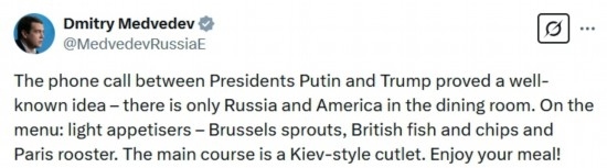 俄羅斯總統(tǒng)普京同特朗普18日通電話。俄聯(lián)邦安全會議副主席梅德韋杰夫就此表態(tài)稱,這表明餐廳里只有俄美,歐洲和烏克蘭都在菜單上,歐洲是開胃小菜,而主菜是烏克蘭。