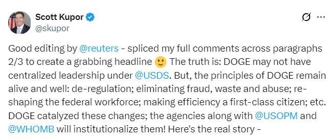 路透社還援引美國人事管理局局長庫珀的消息,稱“政府效率部”已“不存在”,并稱其已不再是一個“集中式機(jī)構(gòu)”。