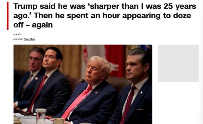 美國有線電視新聞網(wǎng)(CNN)注意到,當(dāng)美國商務(wù)部長盧特尼克談及貿(mào)易戰(zhàn)時,特朗普“似乎難以睜開眼睛”。在美國教育部長麥克馬洪和美國衛(wèi)生與公眾服務(wù)部長小羅伯特·肯尼迪發(fā)言時,特朗普“似乎僵住了,閉著眼睛,每次持續(xù)10到15秒,然后才轉(zhuǎn)動眼球或點頭”。
