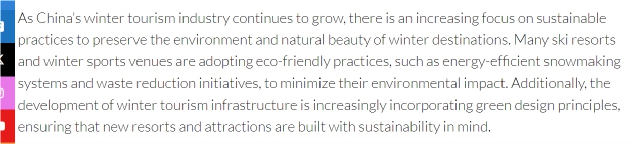 文章還說,隨著中國(guó)冬季旅游產(chǎn)業(yè)的不斷壯大,可持續(xù)發(fā)展理念、環(huán)保實(shí)踐也日益受到重視。中國(guó)正成為越來越有吸引力的冬季旅游目的地。