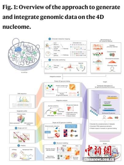 該論文介紹,人類染色體的三維組織結(jié)構(gòu),對于協(xié)調(diào)遺傳物質(zhì)調(diào)控生物反應(yīng)過程起到重要作用。DNA纏繞組蛋白形成名為染色質(zhì)的復(fù)合體,存儲在細胞核內(nèi)。大量染色質(zhì)位點可通過生物化學(xué)修飾來調(diào)控基因表達。繪制這一三維結(jié)構(gòu)及其如何經(jīng)時(第四維度)改變的工作,被稱為4D核組學(xué)。