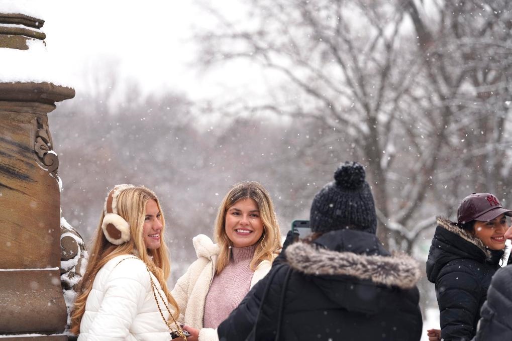 12月27日,在美國紐約中央公園,人們在雪中留影。新華社記者張鳳國攝