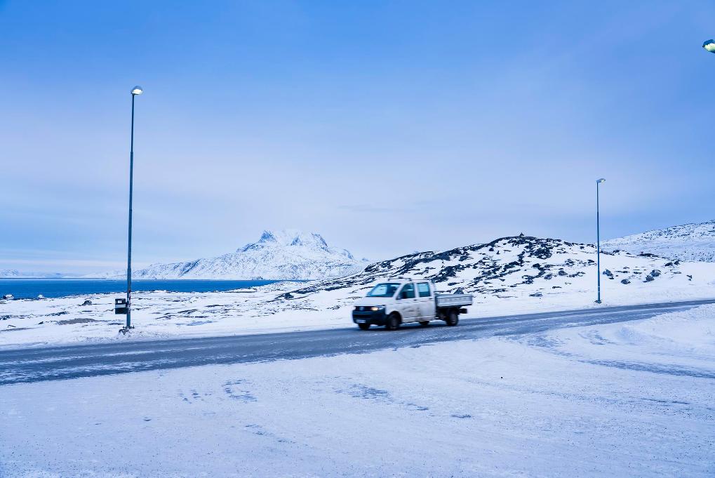 1月16日,一輛汽車行駛在丹麥自治領(lǐng)地格陵蘭島首府努克市郊。新華社發(fā)(安德斯·孔斯豪格攝)
