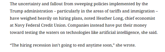 報(bào)道還援引美國海軍聯(lián)邦信用合作社(Navy Federal Credit Union)首席經(jīng)濟(jì)學(xué)家希瑟·朗的觀點(diǎn)稱,特朗普政府推行的一系列政策,尤其是關(guān)稅和移民政策,所帶來的不確定性及后果對招聘計(jì)劃造成了沉重影響。希瑟·朗認(rèn)為,招聘市場的低迷狀況短期內(nèi)不會結(jié)束。