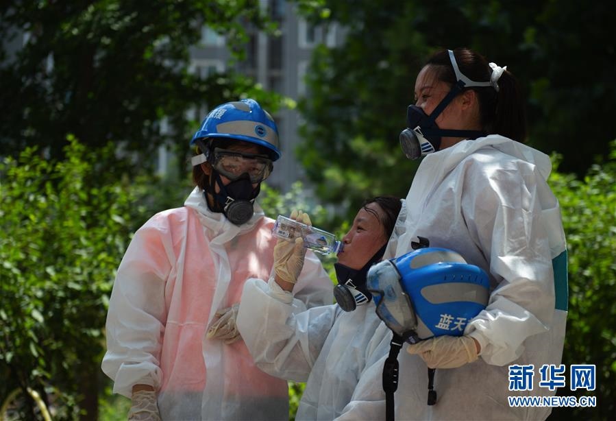 6月16日,北京藍(lán)天救援隊(duì)隊(duì)員在完成對(duì)豐臺(tái)區(qū)一居民區(qū)消殺作業(yè)后休息。連日來(lái),北京出現(xiàn)高溫天氣??崾钪?,工作人員堅(jiān)守抗擊疫情一線,成為烈日下的“逆行者”。新華社發(fā)(陳鐘昊攝)