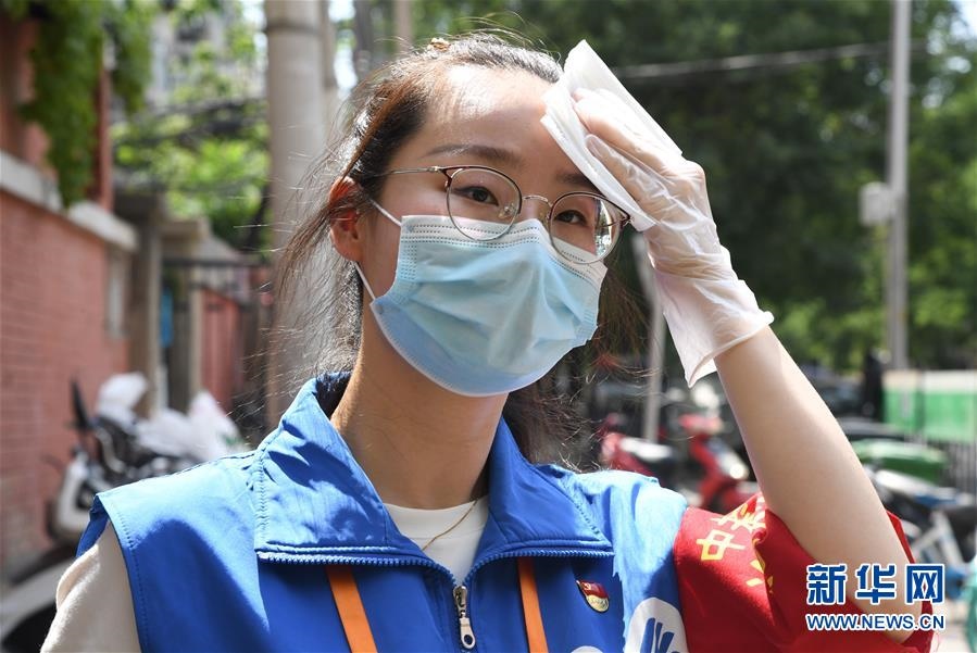6月16日,在北京市海淀區(qū)中關(guān)村街道白塔庵社區(qū)出入口,疫情防控志愿者王玥在擦拭汗水。連日來(lái),北京出現(xiàn)高溫天氣??崾钪?,工作人員堅(jiān)守抗擊疫情一線,成為烈日下的“逆行者”。新華社記者任超攝