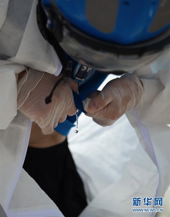 6月16日,北京藍(lán)天救援隊(duì)完成消殺任務(wù)后,一位隊(duì)員的衣服被擰出了汗水。連日來(lái),北京出現(xiàn)高溫天氣??崾钪校ぷ魅藛T堅(jiān)守抗擊疫情一線,成為烈日下的“逆行者”。新華社發(fā)(陳鐘昊攝)