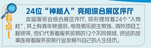 穿過展示屏區(qū)域,可以看到24根“人物柱”,上面展示著來自服務貿(mào)易十二大領域“行業(yè)故事講述人”的工作和生活故事。